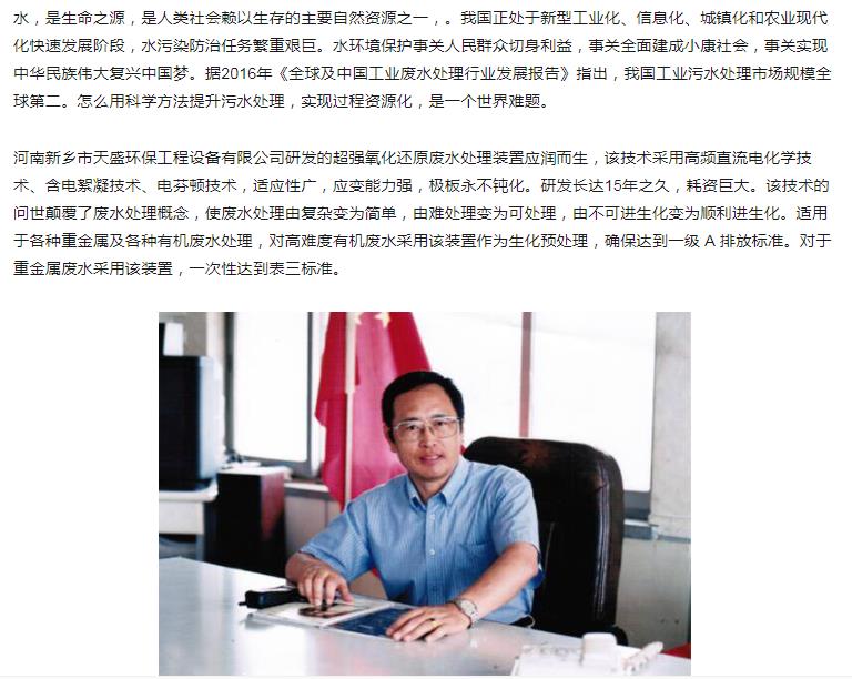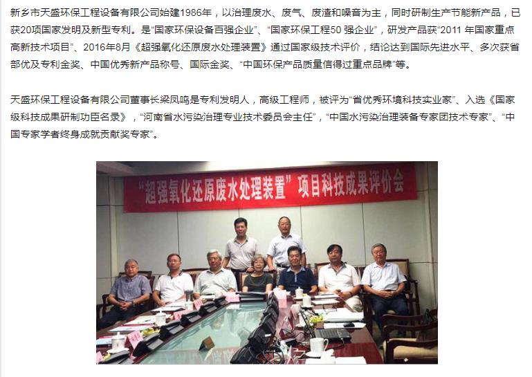 中國高新技術網發布:《關注:解碼科技創新》——新鄉市天盛環?!俺瑥娧趸€原廢水處理技術”