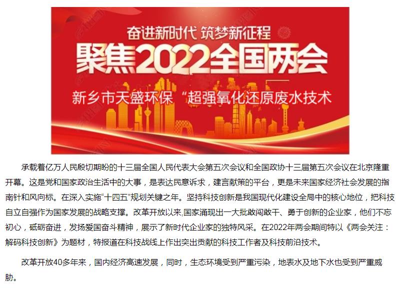 中國高新技術網發布:《關注:解碼科技創新》——新鄉市天盛環保“超強氧化還原廢水處理技術”